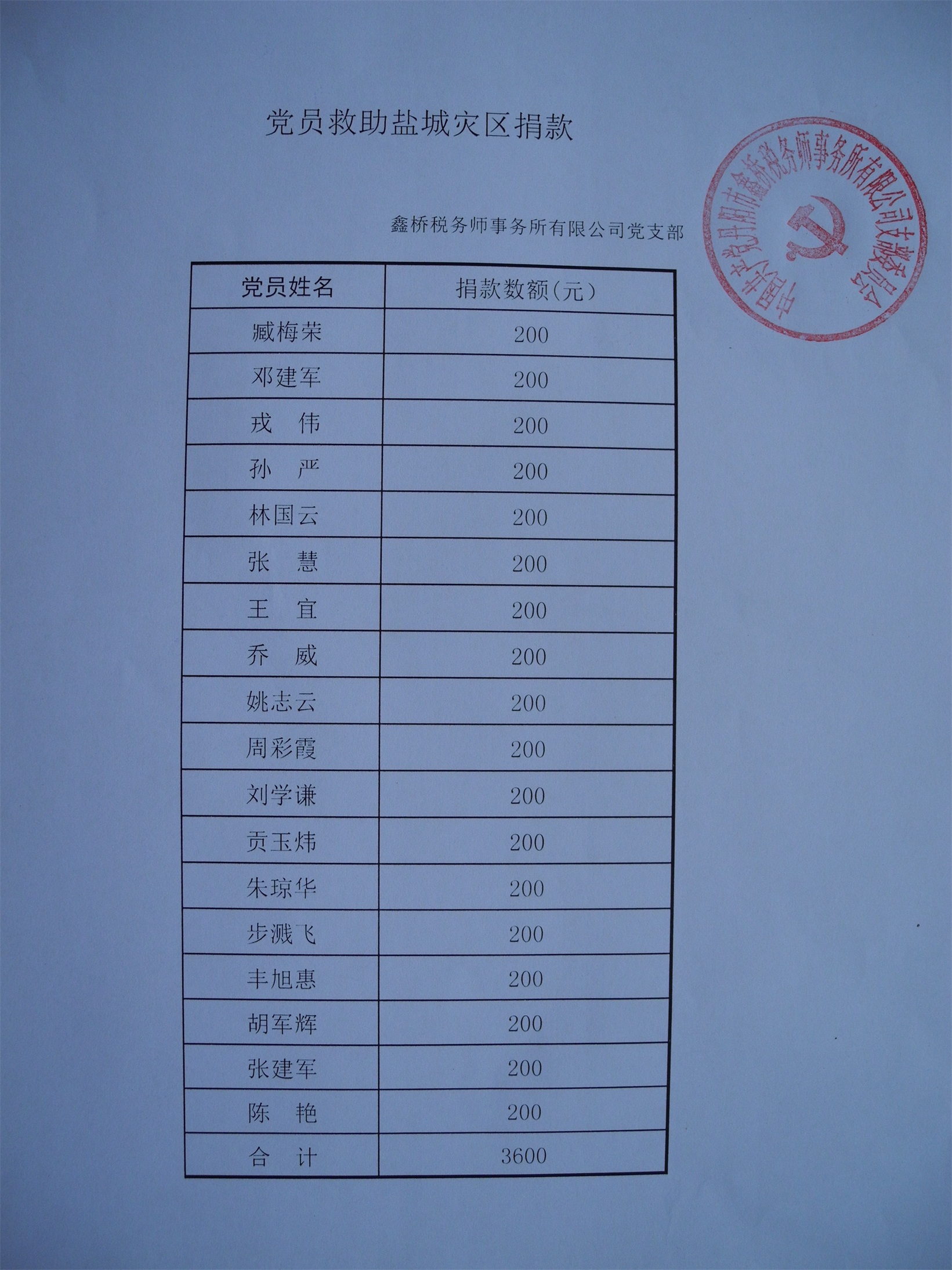 鑫桥税务师事务所党支部积极响应市委组织部倡议,发动党员对灾区捐款。总共收到捐款3600元。