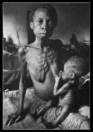 干瘪的乳房含在一个骷髅般孩子的嘴中,那里面其实早以没有奶水。为了安慰孩子的饥饿