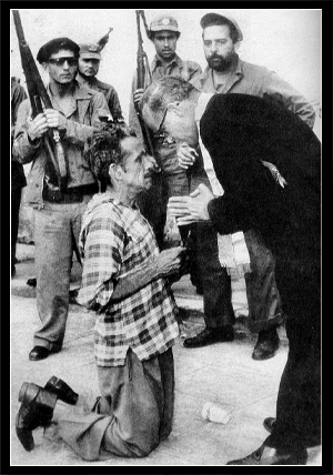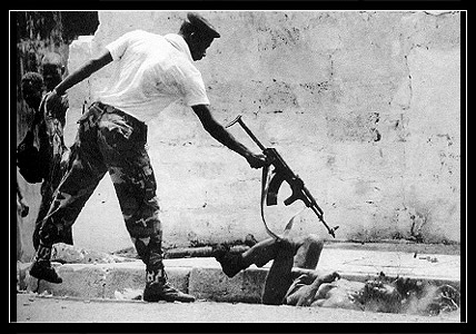 一个政府军的士兵在枪毙一个叛军,他的枪尽量接近敌人的脸。子弹过后,那面孔就像西