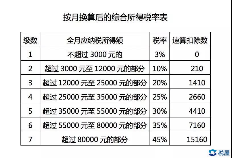 Step2:查找税率,参照《按月换算后的综合所得税率表》,3500元适用的税率为10%,速算扣除数为210元。